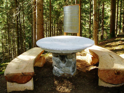 Der Tischsockel wurde aus vielen großen und kleinen Steinen aus der Umgebung gemauert. Die augenförmige Tischplatte aus Granit steht für Beständigkeit.